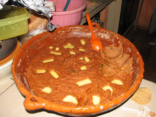 calabaza, cacahuate, granos tostados y molidos con el caldo de la carne